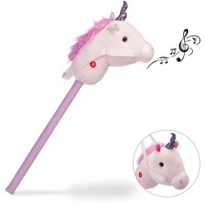 AmazonMagical: Pink unicorn hobby horse - Especially a great toy for little girls With sounds: Stick horse with fun sound effects - Push a button to activate neighing and galloping sounds Cute: Soft head with shiny horn and pink mane - Pink bridle with hook & loop fastener Versatile: Play at home, outdoors or at a children’s birthday party - For kids ages 3 and up Details: Soft plush head - Stable wooden pole with textile cover - Total length of app. 74 cm, Manufacturer: Relaxdays