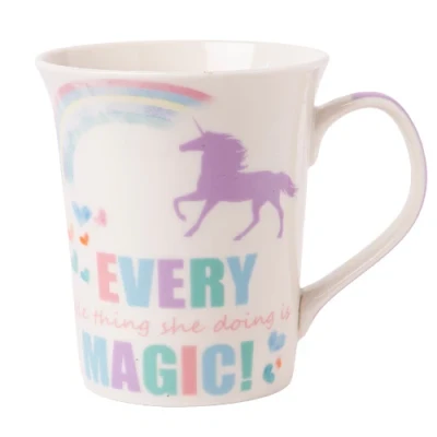 Bring a touch of magic to your tea or coffee break with these charming 350ml unicorn mugs. Each features a whimsical pastel unicorn design, soft rainbow hues, and sweet slogans that brighten your day.. 350ml bone china mug – perfect for tea, coffee, hot chocolate. 4 assorted designs with unicorns, hearts, and rainbow slogans. Pastel colour palette with glossy finish and curved handle. Made from lightweight yet durable bone china. Great as gifts for kids, teens, unicorn lovers or stationery-style décor fans. Dimension H 10.5cm x W 9cm approx