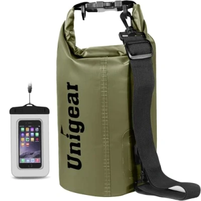 WATERPROOF MATERIAL: Made of stiff 500D PVC material and designed with roll-top closure, Unigear waterproof bag protects your phones, camera, clothes, documents and snacks from Water, Sand, Dust and Dirt ANTI LEAK AND ANTI TEAR: Features fully welded seams by high-frequency tech, our dry sack provides a stronger and more durably waterproof construction. Abrasion resistant for long lasting, perfect for boating, @@@cQbCfItqOYykcTt49ooncExsMca4Xnir@@@, paddling, swimming and hiking EASY AND COMFORTABLE TO CARRY: Comes with a single strap for 2L/5L/10L/20L dry bags, two straps for 30L and 40L.Extra-long and adjustable for convenient carry & comfort. Multi styles to carry for better looking. Reinforce the stress point of D-rings with double sewing, no ripping again even for heavy load VERSATILE AND DURABLE: You can leave the dry bag float on the water during river trip or other water sporting, no more worry about your items getting wet. The buckle and D-rings are upgraded with POM material, stronger than other traditional buckle. It will not break for frequent use Multiple sizes available: 2L / 5L / 10L / 20L / 30L / 40L / 55L. Choose the perfect size to meet your needs, making it the ideal companion for outdoor adventures