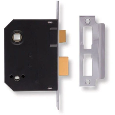 General description This chrome-finished mortice bathroom lock is designed for timber doors hinged on either side, accommodating a thickness of up to 54mm. It features a reversible latchbolt that can be operated by lever handles from both sides and includes turn and emergency release functions. The lock can be deadbolt locked or unlocked by a separate turn (not included) from inside, and the deadbolt can be unlocked from outside via an emergency release (not included). It is suitable for lightweight knobs or sprung handles but is not compatible with unsprung lever handles. Technical specifications Case size: 63mm x 102mm (2.5 inches) Backset: 44.5mm (distance from door edge to center of keyhole) Centre distance: 57mm (distance from handle follower to keyhole center) Material: Steel with black powder coat finish Follower size: 8mm square, with a 5mm turn follower Security level: Ranges from 2 to 5 levers Compatibility and accessories Suitable for timber doors hinged on the left or