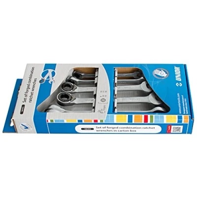 Material: Chrome Vanadium Fully hardened Reversible Fork ratchet ring spanner set in a display box,, Weight: 1.8099951710200002 pounds, Manufacturer: Unior D.D.