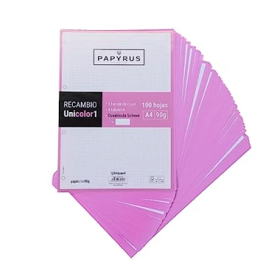 Replacement of 100 sheets of A4 paper. Interior striped in blue color with 5 mm grids. Side color band, light pink. Sheets with 4 holes for filing cabinets. Super sturdy paper extrablanco paperclas90g