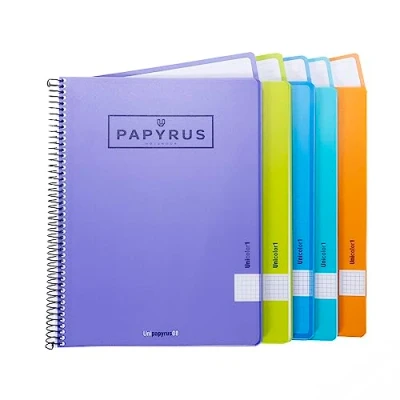 Pack of 5 notebooks with micro-perforated sheets with 4 holes and colour band matching the covers. Interior grid sheets 5x5 mm in blue ink. Extruded caps made of 700 micron translucent polypropylene in random assorted colors. 80 sheets of heavy duty paper "Paperclas90g". A4+ size and spiral binding with COIL-LOCK safety lock.