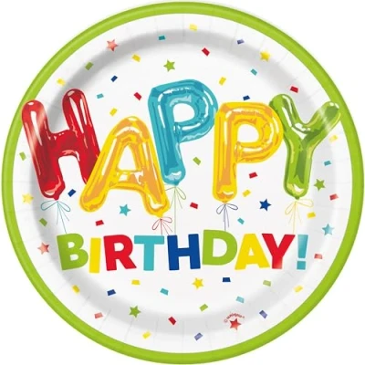 Pack of 8 Happy Balloon Birthday Party Plates Paper plates measure approximately 18 cm in diameter Ideal for serving cake at any birthday party Disposable plates are 100% plastic free Combine with other Happy Balloon Birthday party supplies from Unique Party, Manufacturer: Unique Party
