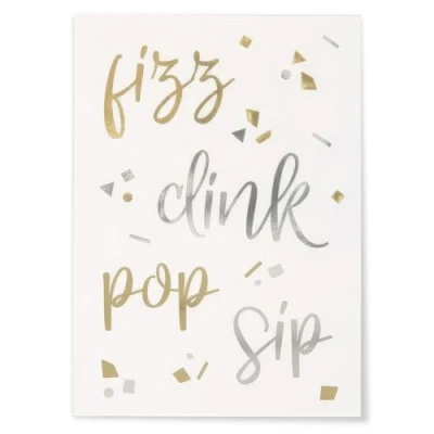 1 Sheet of Drink Glass Clings Includes 4 total clings ("Fizz", "Clink", "Pop", and "Sip") Moisten cling before applying to a smooth sided glass Makes a stylish way to assign drinks to guests Combine with other gold party supplies from Unique Party, Manufacturer: Unique Party