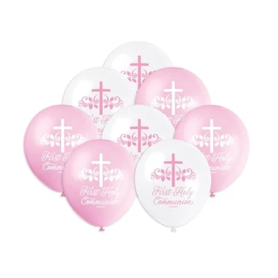 Pack of 8 Pink Holy Cross Communion Balloons Latex balloons measure 30 cm when fully inflated (ship flat) Ideal for decorating a Communion celebration Packaged balloons may vary in colour or shade from inflated balloons Combine with other Pink Holy Cross religious party supplies from Unique Party, Manufacturer: Unique Party