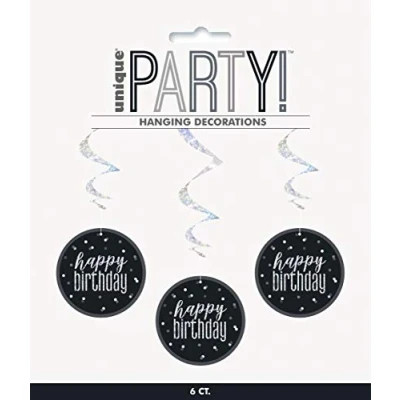 PACKAGE INCLUDES: 6 prismatic black birthday hanging swirls. ATTRACTIVE DESIGN: Create an eye-catching party room decoration with these hanging decorations. PERFECT FOR BIRTHDAY: These swirls are ideal for birthday party and matches them with other party supplies and decorations. DURABLE QUALITY: These swirls are made of durable foil and cardstock that is strong enough to reuse for the next party. EASY TO USE: These swirls are easy to assemble and easy to use, just simply hang this on the wall or ceiling and it will surely create a fantastic party decoration., Manufacturer: Unique