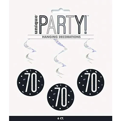 PACKAGE INCLUDES: 6 prismatic black 70th birthday hanging swirls. ATTRACTIVE DESIGN: Create an eye-catching party room decoration with these hanging decorations. PERFECT FOR BIRTHDAY: These swirls are ideal for 70th birthday party and matches them with other party supplies and decorations. DURABLE QUALITY: These swirls are made of durable foil and cardstock that is strong enough to reuse for the next party. EASY TO USE: These swirls are easy to assemble and easy to use, just simply hang this on the wall or ceiling and it will surely create a fantastic party decoration., Manufacturer: Unique
