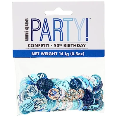 PACKAGE INCLUDES: 1 pack of blue prismatic 50th birthday confetti. SHIMMERING DESIGN: Create an eye-catching table setting with this birthday confetti. PERFECT FOR BIRTHDAY: This confetti is ideal for 50th birthday party and matches them with other party supplies and decorations. DURABLE QUALITY: This pack of confetti is made of durable cardstock. EASY TO USE: Simply sprinkle this confetti on your buffet table to create a lovely table setting., Manufacturer: Unique