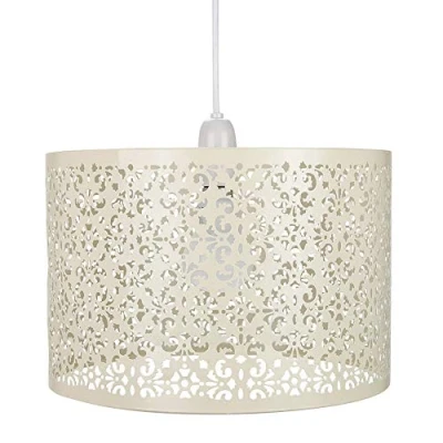 Moroccan style metal non-electrical circular pendant shade with intricate laser-cut decoration. Finished in country cotswold cream and available in several other colours. The product dimensions are: Height - 19cm, Depth - 29cm, Width - 29cm. Maximum wattage allowed is 60w. Please note that ceiling rose and cable is not included - pendant shade only being sold. Complete with shade reducer ring allowing for most lamp bases - B22/BC, E14/SES and E27/ES. Light bulb not included., Weight: 1.9621141318 Pounds, Manufacturer: Happy Homewares