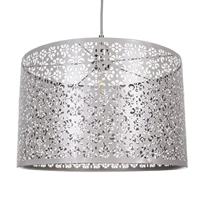 Moroccan style metal non-electrical circular pendant shade with intricate laser-cut decoration creating a stunning light effect against the wall. Finished in matt grey and available in several other colours. Suitable for pendant wires as well as medium-large table lamp and floor lamp bases. The product dimensions are: Height - 25cm, Depth - 40cm, Width - 40cm. Maximum wattage allowed is 60w. Please note that ceiling rose and cable is not included - pendant shade only being sold. Complete with shade reducer ring allowing for most lamp bases - B22/BC, E14/SES and E27/ES. Light bulb not included., Weight: 3.4833037396 Pounds, Manufacturer: Happy Homewares