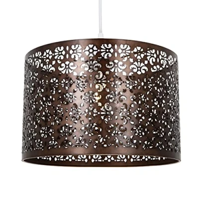 Moroccan style metal non-electrical circular pendant shade with intricate laser-cut decoration creating a stunning light effect against the wall. Finished in unique matt bronze and available in several other colours. The product dimensions are: Height - 19cm, Depth - 29cm, Width - 29cm. Maximum wattage allowed is 60w. Please note that ceiling rose and cable is not included - pendant shade only being sold. Complete with shade reducer ring allowing for most lamp bases - B22/BC, E14/SES and E27/ES. Light bulb not included., Weight: 1.9400679056 Pounds, Manufacturer: Happy Homewares