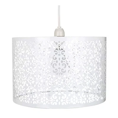 Moroccan style metal non-electrical circular pendant shade with intricate laser-cut decoration. Finished in matt white and available in several other colours. The product dimensions are: Height - 19cm, Depth - 29cm, Width - 29cm. Maximum wattage allowed is 60w. Please note that ceiling rose and cable is not included - pendant shade only being sold. Complete with shade reducer ring allowing for most lamp bases - B22/BC, E14/SES and E27/ES. Light bulb not included.