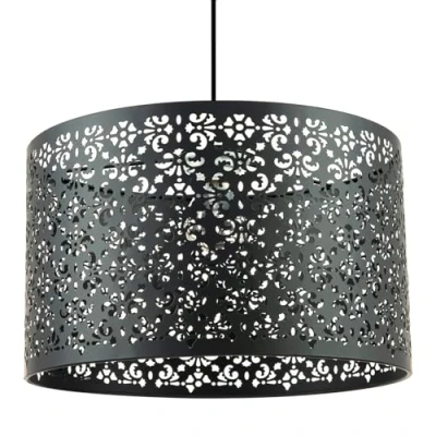 Moroccan style metal non-electrical circular pendant shade with intricate laser-cut decoration creating a stunning light effect against the wall. Finished in matte black and available in several other colours. Suitable for pendant wires as well as medium-large table lamp and floor lamp bases. Total product dimensions are as follows: Height - 25cm, Depth - 40cm, Width - 40cm. Maximum wattage allowed is 11w. Please note that ceiling rose and cable is not included - pendant shade only being sold. Complete with shade reducer ring allowing for all lamp bulb bases - B22/BC, E14/SES and E27/ES. Light bulb is not included., Weight: 4.188782978 Pounds, Manufacturer: Happy Homewares