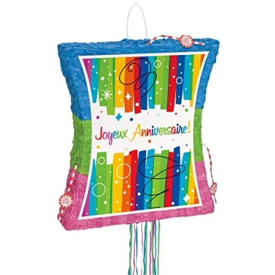PACKAGE INCLUDES: 1 rainbow "Joyeux Anniversaire" 3D pull string pinata. ATTRACTIVE DESIGN: Elevate your party atmosphere with this attractive 3D pinata. PERFECT FOR KIDS PARTY: Perfect fun game at your kids birthday, baby shower, gender reveal, school party, and more. LIGHTWEIGHT AND STURDY: This pinata is made of cardstock and covered fringe tissue papers. Choking Hazard. Small parts. Not suitable for children under 3 years., Manufacturer: Unique