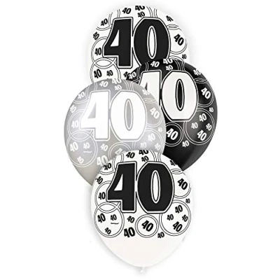 Pack of 2 Black, 2 Silver and 2 White Latex Balloons Pearlised Black and Silver Birthday Balloons measure 12" (30cm) when fully inflated with air or helium (ship uninflated) Featuring "40" text printed all over, these balloons are ideal for celebrating at a 40th birthday party Packaged balloons may vary in colour or shade from inflated balloons Coordinate with other Glitz Black 40th Birthday party supplies and party decorations from Unique Party