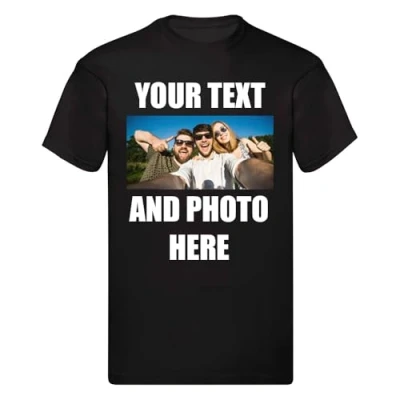 Unisex Personalised T Shirt Custom Print Tee Your Own Photo/Design and Text Black