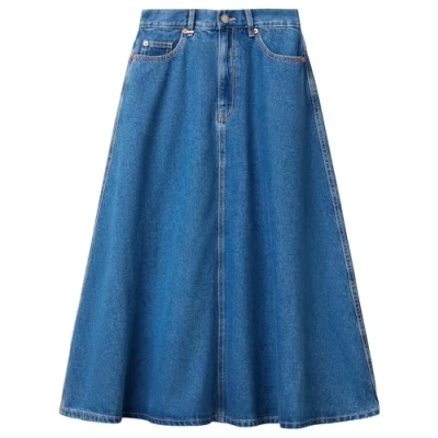 Denim skirt with flared cuts Calf length with elastic at back waistband and 5 pockets 53% Lyocell, 47% Cotton