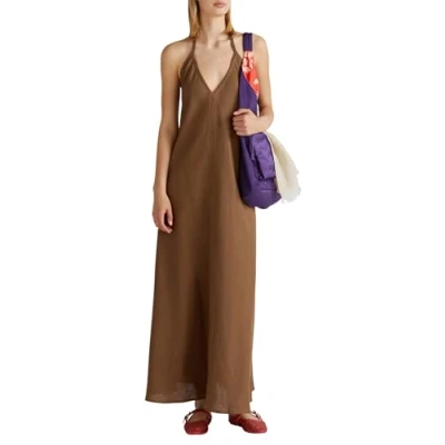 Long linen dress with bias cut with dry fit. Backless bikini neckline and topstitching details at sleeve edges. 100% Linen