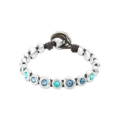 Uno de 50Bracelet with brown leather base and button clasp, covered with silver-plated metal lentils and blue Swarovski crystals. Designed by UNOde50, 100% handcrafted in Spain.