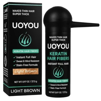 Instant, Natural Fullness – Electro-statically charged keratin fibres cling to existing hair to disguise thinning areas in seconds and look like real hair. Hair Fibres Applicator Included (Precision Control) – The pump sprayer targets thinning areas and bald spots, reducing waste and mess compared to shake-on only. Undetectable Finish – UOYOU hair building fibers Blend seamlessly with LIGHT BROWN shade; works for short or long styles and all hair types. Sweat & Wind Resistant, Yet Easy to Wash Out – Locks in for day-to-day confidence; simply shampoo to remove. Salon-Ready Size (27.5g) – Generous bottle designed for daily use; cruelty-free and suitable for men & women.
