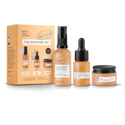 UpCircle The Discovery Set features a trio of natural, vegan skincare essentials—Cleansing Face Milk, Peptide Serum, and Face Moisturiser—crafted with upcycled and organic ingredients to cleanse, hydrate, and rejuvenate skin. Perfect for ethical beauty lovers, all products are cruelty-free and come in fully recyclable packaging.