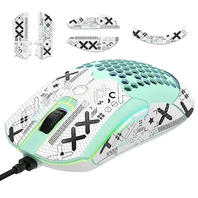 DESIGNED FOR GAMES -This ultra -light mouse whit anti Slip grip tape is designed for professional gamers. The wired mouse uses professional chip Pixart Paw3325, ultra-high 12000DPI, ultra-light honeycomb nest design, and a soft and comfortable mouse sticker, self-adhesive design, excellent anti -slip and absorbing sweat, which can bring you to you A better gaming experience! SUPER LIGHT HONEYCOMB SHELL-In order to better achieve ultra-light demand and improve the movement speed, the game mouse uses honeycomb shells and ultra-light editing cables. The weight of the mouse is only 65 grams. Wired design can also reduce the problem of lagging performance. This mode enhances fast and relaxed gameplay, and helps users maintain strong grip by touching the surface of the palm. HIGH-QUALITY MOUSE GRIP TAPE-In order to upgrade the experience, this model is designed for this ergonomic mouse and can perfectly fit the entire mouse. The surface of the mouse skin is a 3D three -dimensional pressure flower, which is not easy to fade, and has better anti -slip and waterproof performance and soft feel. And it uses 3M non -residual adhesive to install and delete. HIGH-PRECISION 12000 DPI-Gaming mouse uses senior Pixart PAW3325 Optical Sensor. It has 6 editable DPI levels (default: 800-1600-2400-3200-6400-12000), which is easy to switch between different game needs. High-precision sensors can provide accurate accuracy, greater durability and extreme response capabilities, so that you are more advantageous in the competition. The rotation rate is 125-1000Hz to provide accurate exercise for gameplay. RGB BACKLIT & PROGRAMMABLE MOUSE-This PC gaming mouse has 26 backlight modes. You can also choose to customize your own RGB backlight through editing programs. The 16.8 million color options set by the backlight make your gaming mouse look cool. 7 programmable buttons can allow the mouse driver software to configure and allocate complex macro function.