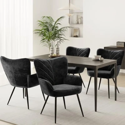Premium Velvet Upholstery Upholstered in soft, breathable velvet fabric, this dining chair offers a smooth, skin-friendly touch with a subtle sheen. The plush surface adds warmth and elegance to any dining room while remaining comfortable for everyday meals. Ergonomic Curved Back & Armrests Designed with a gently curved ergonomic backrest and integrated armrests, this dining room chair provides excellent support for your back and arms, helping you sit comfortably during long dinners and family gatherings. Comfortable Wide Padded Seat Featuring a generously wide, thickly padded seat, this upholstered dining chair ensures lasting comfort. Ideal as a kitchen chair or dining table chair for extended seating without discomfort. Sturdy Metal Legs with Anti-Slip Feet Supported by sleek black metal legs, this dining chair offers strong stability and durability. Anti-slip foot protectors help prevent floor scratches while keeping the chair steady on different surfaces. Modern Nordic Dining Room Style With its modern Nordic-inspired design and elegant leaf-pattern stitching, this dining chair blends effortlessly with contemporary dining rooms, kitchens, or open-plan spaces, making it a stylish and practical dining room chair choice.
