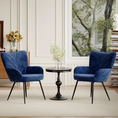 Upholstered Velvet Dining Chair with Armrests, Modern Nordic Room Chair, Soft Padded Seat Ergonomic Back, Black Metal Legs,Blue