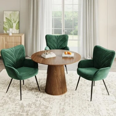 Premium Velvet Upholstery Upholstered in soft, breathable velvet fabric, this dining chair offers a smooth, skin-friendly touch with a subtle sheen. The plush surface adds warmth and elegance to any dining room while remaining comfortable for everyday meals. Ergonomic Curved Back & Armrests Designed with a gently curved ergonomic backrest and integrated armrests, this dining room chair provides excellent support for your back and arms, helping you sit comfortably during long dinners and family gatherings. Comfortable Wide Padded Seat Featuring a generously wide, thickly padded seat, this upholstered dining chair ensures lasting comfort. Ideal as a kitchen chair or dining table chair for extended seating without discomfort. Sturdy Metal Legs with Anti-Slip Feet Supported by sleek black metal legs, this dining chair offers strong stability and durability. Anti-slip foot protectors help prevent floor scratches while keeping the chair steady on different surfaces. Modern Nordic Dining Room Style With its modern Nordic-inspired design and elegant leaf-pattern stitching, this dining chair blends effortlessly with contemporary dining rooms, kitchens, or open-plan spaces, making it a stylish and practical dining room chair choice.