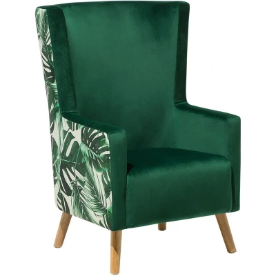 General description Liven up your surroundings with the Wingback Chair ONEIDA, a beautifully upholstered high back chair featuring a striking palm leaf print. Designed in a classic wingback form, this chair offers exceptional comfort with its pleasantly curved armrests and smooth velvet upholstery in a rich dark green shade. The slanted wooden legs add a retro feel, making it a perfect fit for modern interiors while adding unique character to any room. Technical specifications Product Type: Wingback Chair Style: Retro General Color: Green, Beige, Brown Shade: Dark Green Main Material: Velvet Material Composition: 100% Polyester Additional Material: Rubberwood Filling Material: Foam Legs Material: Wood Seat Foam Density: 24 kg/m3 Dimensions: Armrests Height: 61 cm, Depth: 60 cm, Seat Height: 44 cm, Width: 74 cm, Height: 108 cm, Seating Surface: 50x50 cm Weight: 19 kg Weight Capacity: 150 kg Installation Assembly time: 20-40 min Legs to be fitted upon setup Usage Recommended to check