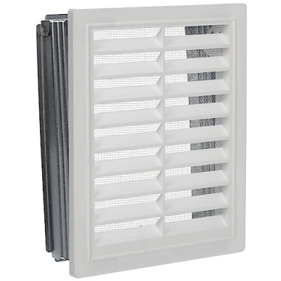 Polystyrene, white ≈ RAL 9016 Galvanised mounting frame (when installed in masonry fixing the frame by mortar / when installing in drywall screw frame to the substructure) Large air flow (over 70% of the wall opening), Manufacturer: Upmann