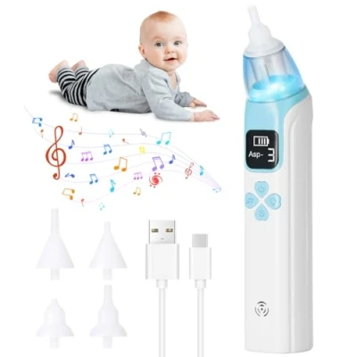 3 SUCTION MODES: The anti-backflow nose sucker device offers 3 adjustable suction modes, which can easily remove mucus and nasal mucus without residue, allowing your baby to breathe easily SAFE AND COMFORTABLE: The baby nasal aspirator comes with 4 food-grade silicone heads, which are made of soft material and will not hurt the nasal mucosa; it is suitable for all children aged 0-10 years old and can gently clean the baby's nasal secretions SOOTHING SOUND AND LIGHT: The baby nose cleaner is equipped with an LCD display and music, color-changing lights and music soothing function, which can attract the baby's attention and make the baby more adaptable, enjoy the fun of comfortable breathing USB CHARGING: The electric baby nose sucker mucus suction cup is rechargeable and portable; it can be used for 120 minutes after being fully charged, and can be used for a long time; the compact design is very suitable for out-of-home care EASY TO CLEAN: The package contains 4 reusable nasal aspirators of different sizes, suitable for babies of different ages and conditions; they can be cleaned directly under the tap after each use