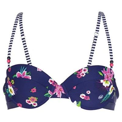 Comfortable and supportive underwire bikini top Spaghetti straps colourful beading details Retro striped print details, and navy Hawaiian print