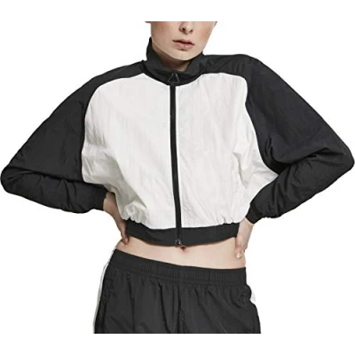 Short-cut, sporty track jacket for women made from crinke material so that it not only looks retro, but also feels like it Sleeves in contrasting colour in sporty raglan cut Elasticated cuffs ensure a perfect fit of the short women's jacket Fashionable stand-up collar with eye-catching triangle zip A click on the brand logo leads to the Urban Classics Brand Store and even more trendy streetwear