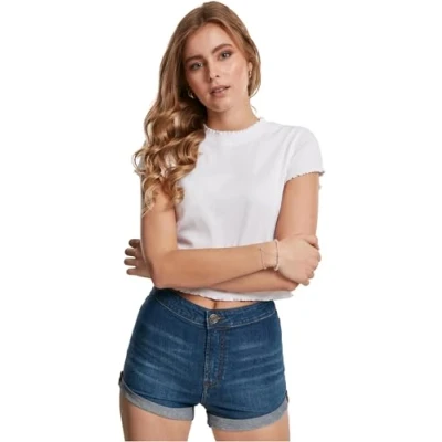Ribbed crew neck Cropped Bevelled sleeves Rolled hem on the sleeves and hem A click on the brand logo leads to the Urban Classics Brand Store and even more trendy streetwear