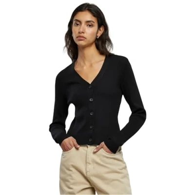 Short women's knitted vest in classic design Made from polyacrylic, viscose and nylon Slim fit V-neck with cuffs and button placket Sleeve ends and hem without cuffs