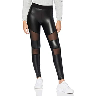 Urban Classics Ladies Tech Mesh Faux Leather Leggings, Stylish Women's Leggings Made of Leather, in Sizes XS 5XL, Black, L