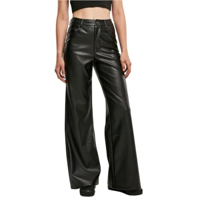 Trendy women's trousers in 5-pocket shape with ultra wide leg Made of faux leather (viscose), oversized fit High waistband with belt loops Long leg A click on the brand name leads to the Urban Classics Brand Store and even more trendy streetwear