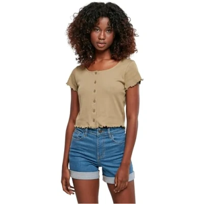 Urban Classics Women's Ladies Cropped Button Up Rib Tee T Shirt, Khaki, XXXL