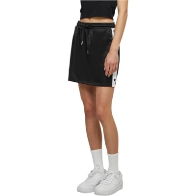 Hardly anything stands for the style of the 90s like the track pants with the buttons on the side The sporty track pants are now also available as a skirt - of course with the buttons on the side Available in black or white The shiny fabric and the indicated press studs ensure the perfect retro style A click on the brand logo leads to the Urban Classics Brand Store and even more trendy streetwear