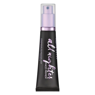 Prime, hydrate and lift your skin with the Urban Decay All Nighter Face Primer, a long-wearing foundation grip in a universal shade to suit all.. Keep your base looking fresh for up to eight hours with the All Nighter Primer from Urban Decay. This primer has a lightweight texture that glides onto the skin effortlessly blurring the complexion. As soon as you apply it will reduce the appearance of pores and smooth out any fine lines, leaving skin feeling soft-to-the-touch with the perfect canvas for applying makeup.. It's hydrating formula goes on sheer, lightweight, plus its universally flattering shade means it's suitable for all skin tones. This blurring primer preps the skin so that foundation lasts longer. And, for those no make-up days, it can also be worn alone for when you need to blur minor imperfections.. Why We Love It. Applying primer prior to your foundation is one of the best ways to make your base last longer, but some primers can make your skin dry. What we love about the All Nighter Face primer is the fact that it not only grips onto our base, making it last longer throughout the day, but it also gives your complexion a hydration boost for healthier skin without makeup. Trust us, this is about to become an everyday essential!. How To Use It. After your skincare regime, apply a pea-size amount to your face using either your fingertips or a brush from the centre of your face and outwards.. Top tip: If you're having a no-foundation day, try applying this primer alone followed by a little concealer and blush for a fresh-faced look.. Works Well With. For an extra step to prolong your makeup further, why not pair your new primer with one of the Urban Decay setting sprays for a look that stays locked-in all day and night?. Values. Vegan*. PETA certified cruelty-free'‹.. *Vegan formula: does not contain animal-derived ingredients.