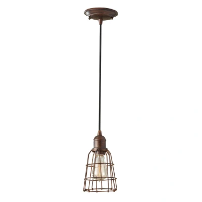 This mini pendant features a Parisian bronze drop rod holding a caged effect shade.