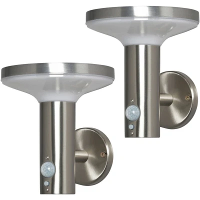 General description Bring practical and energy-efficient lighting to the outside of your home without the need for wiring with the Pack of 2 Uris Outdoor Solar LED Wall Lights. These stainless steel solar lights are IP44 rated and feature a PIR sensor that activates the light when motion is detected, helping to keep your home and garden secure. Easy to install, these solar lights look great on doorways, pathways, and patios. Technical specifications Product Type: Outdoor Wall Light Bulbs Required: 1 (Integrated) Bulb Type: Integrated LED (Non Replaceable) Max Bulb Wattage: 5.6 Watt Max Bulb Voltage: 240 Volt Height: 18 cm approx. Width: 16.2 cm approx. Length: 16 cm approx. Lumen: 600 lm Average Lifespan: 20,000 hrs Colour Temperature: 4000k Cool White Material: Aluminium Colour: Stainless Steel Weight: 0.48 kg Battery Operated: Rechargeable 2200 mAh NiMH Run Time: 3-12 Hours Charge Time: 6-8 Hours Usage This Outdoor Wall Light has 3 Modes: Always on 60 Lumen Always on 60 Lumen Until