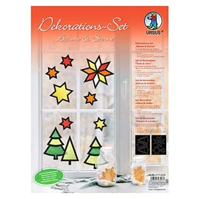 Trees and Stars Decoration Set 8 sheets of photo card 300 g/m², approx. 24.8 x 33 cm, black, laser 9 sheets of tracing paper, 42 g/m², assorted in 6 colours. 6 star diameter each approx. 9 - 21 cm 6 trees each approx. 11 x 20 cm, Manufacturer: Buntpapierfabrik Ludwig Bähr GmbH & Co. KG
