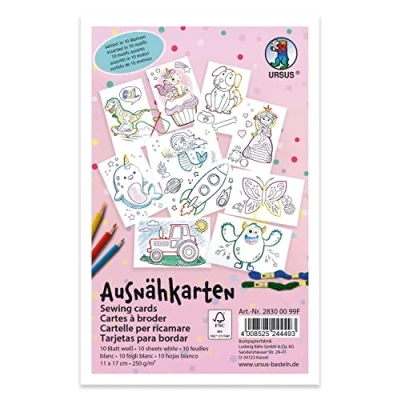 Ursus 28300099F Sewing Cards for Children, 10 White Embroidery with Pre Printed Motifs Embroidering and Colouring, Approx. 11 x 17 cm