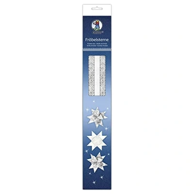 Craft pack with folding strips made from high-quality, refined craft paper Contents: a total of 80 strips of 1.5 x 45 cm, 2 different designs, including craft instructions (English language not guaranteed) Colour: white / silver The craft set allows you to fold 20 Froebel stars with a diameter of approx. 6.5 cm Popular paper stars for crafting in the Christmas season for a beautiful Christmas atmosphere