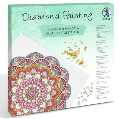Creative set for creating a diamond mandala, with sparkling stones as a chic wall decoration or individual gift Sparkling acrylic stones in the colours red, yellow and green Contents: a mandala on canvas (30 x 30 x 1.5 cm), a pin with adhesive pad, a tray, tweezers, a mounting kit and various acrylic diamonds With detailed instructions for stress-free crafting fun Painting with diamonds promotes your child's fine motor skills in a creative way, Manufacturer: Ursus