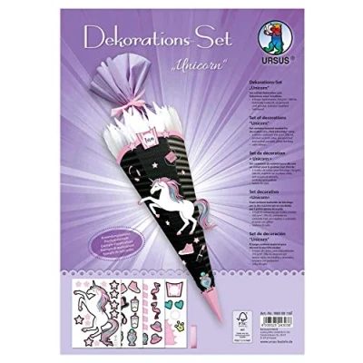 Set for decorating a school cone in unicorn design (school cone blank not included) Contains materials for decorating a school cone, with 4 sheets of craft cardboard 350 g/m², (printed and pre-danced on both sides) including satin ribbon Cute punched pieces in the shape of stars, hearts, crowns, flamingos and much more, ensure bright children's eyes on the finished sugar bag The magical punched parts can be easily glued to a school cone blank and can be individually designed according to personal taste For a stylish and unique sugar cone, ensures an unforgettable introduction to school days, Manufacturer: Buntpapierfabrik Ludwig Bähr GmbH & Co.KG