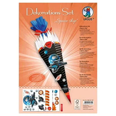 Ursus 9880018F Decorative Space, DIN A4, Set with Materials to Decorate a School Cone, 4 Sheets of Craft Card 350 g/m, Printed and Pre Cut on Both Sides Satin Ribbon, Colourful